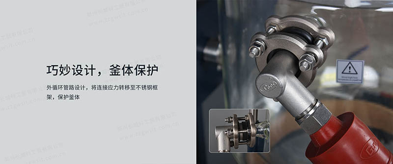 ● 夾套進、出液口連接不銹鋼保溫軟管,減少進出液口應力。